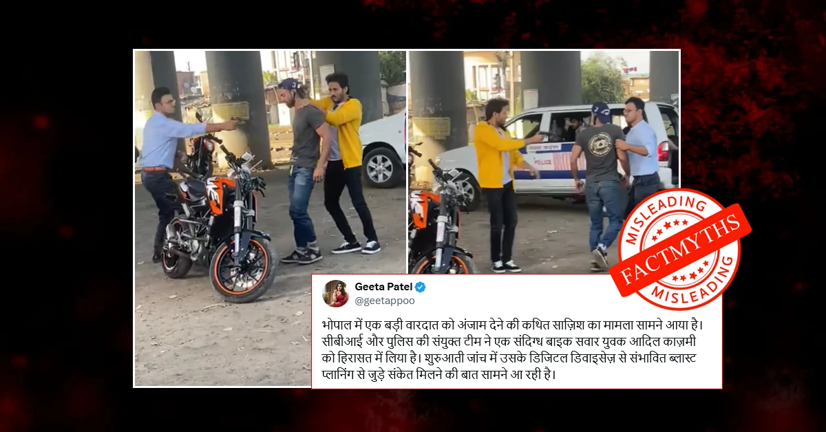 सोशल मीडिया में एक युवक की गिरफ्तारी का वीडियो वायरल है। इस वीडियो के साथ लोग दावा कर रहे हैं कि सीबीआई और पुलिस की सयुंक्त टीम ने मध्यप्रदेश के भोपाल से एक आतंकवादी को पकड़ा है। आदिल काजमी नाम का यह शख्स भोपाल में ब्लास्ट की साजिश रच रहा था।