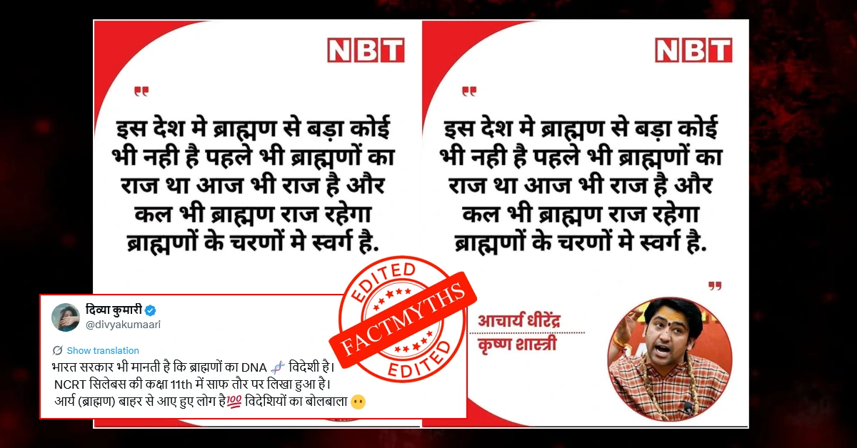 दिव्या कुमारी ने एक्स पर पोस्ट में लिखा, ‘भारत सरकार भी मानती है कि ब्राह्मणों का DNA विदेशी है। NCRT सिलेबस की कक्षा 11th में साफ तौर पर लिखा हुआ है। आर्य (ब्राह्मण) बाहर से आए हुए लोग है विदेशियों का बोलबाला’