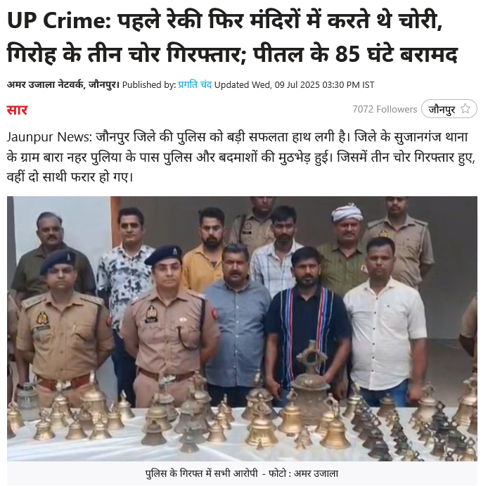 क्या है हकीकत? पड़ताल हमने वायरल वीडियो के स्क्रीनशॉट को गूगल सर्च किया तो अमर उजाला की वेबसाइट पर प्रकाशित रिपोर्ट मिली। 9 जुलाई 2025 को प्रकाशित इस रिपोर्ट के मुताबिक जौनपुर पुलिस ने मंदिरों को निशाना बनाकर चोरी करने वाले गिरोह को पकड़ा। उनके पास से मंदिरों से चोरी हुए पीतल के 85 घंटे बरामद हुए। पुलिस ने बृजेश गौतम, पप्पू उर्फ प्यारे लाल, हरि श्याम अग्रहरि उर्फ भोला उर्फ देव को गिरफ्तार किया है। जबकि इनके दो साथी रिंकू पण्डित उर्फ भीम दूबे उर्फ दीपक, अरुन उर्फ लल्लू उर्फ खलीफा फरार हो गए।