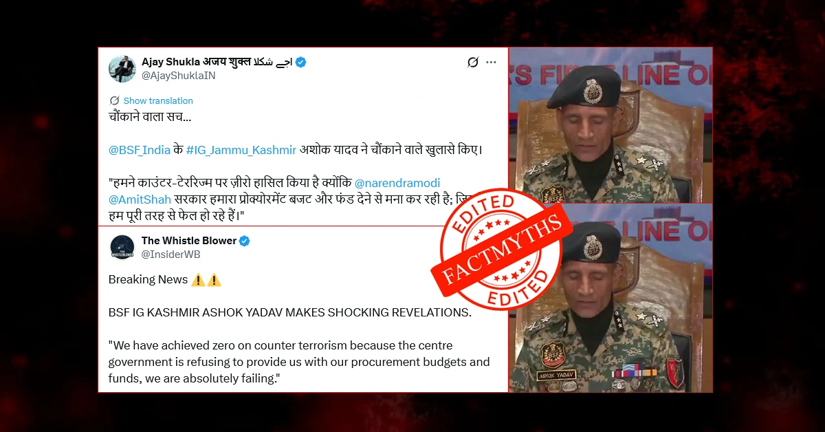 सोशल मीडिया पर BSF IG कश्मीर अशोक यादव का एक वीडियो वायरल है। इस वीडियो में अशोक यादव ने कहा काउंटर टेररिज़्म में हम ज़ीरो पर पहुँच गए हैं क्योंकि केंद्र सरकार हमें आवश्यक बजट और फंड नहीं दे रही है। ऐसे में हमारा काम पूरी तरह प्रभावित हो रहा है। हालांकि हमारी पड़ताल में वीडियो एडिटेड निकला।