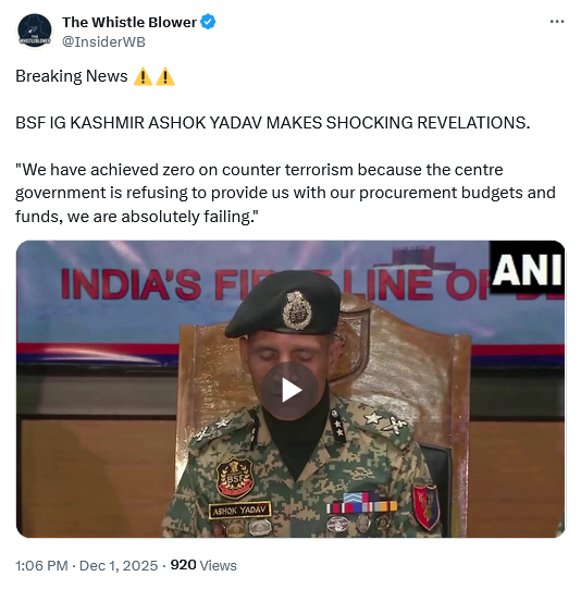 पाकिस्तानी प्रोपेगेंडा अकाउंट The Whistle Blower ने लिखा, ‘बीएसएफ कश्मीर के आईजी अशोक यादव ने चौंकाने वाला बयान दिया। उन्होंने कहा, ‘काउंटर टेररिज़्म में हम ज़ीरो पर पहुँच गए हैं क्योंकि केंद्र सरकार हमें आवश्यक बजट और फंड नहीं दे रही है। ऐसे में हमारा काम पूरी तरह प्रभावित हो रहा है।’