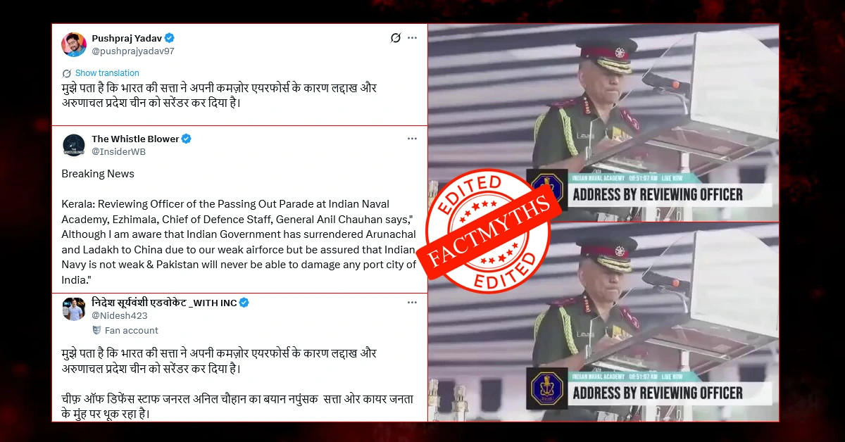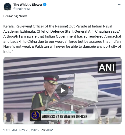 पाकिस्तानी प्रोपेगेंडा अकाउंट The Whistle Blower ने एक्स पर वीडियो पोस्ट करते हुए लिखा, ‘ब्रेकिंग न्यूज़ केरल: इंडियन नेवल एकेडमी, एझिमाला में पासिंग आउट परेड के रिव्यूइंग ऑफिसर, चीफ ऑफ डिफेंस स्टाफ, जनरल अनिल चौहान ने कहा, “हालांकि मुझे पता है कि भारत सरकार ने हमारी कमजोर एयरफोर्स की वजह से अरुणाचल और लद्दाख चीन को सौंप दिया है, लेकिन भरोसा रखें कि इंडियन नेवी कमजोर नहीं है और पाकिस्तान कभी भी भारत के किसी भी पोर्ट सिटी को नुकसान नहीं पहुंचा पाएगा।’