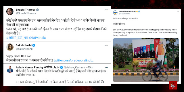 कांग्रेस नेता शशि थरूर ने इस तस्वीर को पोस्ट करते हुए लिखा कि कोई उन्हें समझाए कि हम भारतवासियों के लिए “अतिथि देवो भवः” न कि किसी भाजपा नेता की चाटुकारिता!ध्यान रहे, यह बड़े इंजन की छोटे इंजन के साथ वाला पोस्टर नहीं है। यह हमारे मेहमानों की बेइज्जती है।