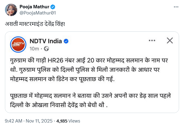 दिल्ली के लाल क़िला के पास जिस कार से धमाका हुआ, उसके मौजूदा मालिक का नाम देवेंद्र सिंह है। डेढ़ साल पहले उन्होंने यह कार सालमान नाम के व्यक्ति से खरीदी थी। लेकिन मीडिया में सिर्फ़ पुराने मालिक का नाम चलाया जा रहा है, जबकि मौजूदा मालिक देवेंद्र सिंह का नाम जानबूझकर छिपाया जा रहा…