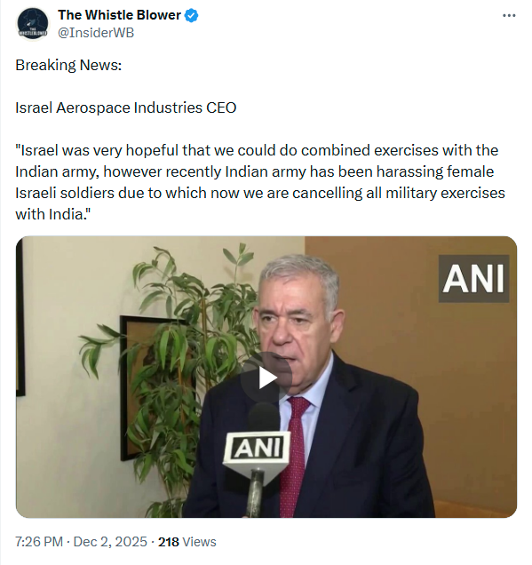 जारब अली ने लिखा, ‘इज़राइल एयरोस्पेस इंडस्ट्रीज़ के CEO “इज़राइल को बहुत उम्मीद थी कि हम इंडियन आर्मी के साथ मिलकर एक्सरसाइज़ कर सकते हैं, लेकिन हाल ही में इंडियन आर्मी ने महिला इज़राइली सैनिकों को परेशान किया है, जिसकी वजह से अब हम इंडिया के साथ सभी मिलिट्री एक्सरसाइज़ कैंसिल कर रहे हैं।’