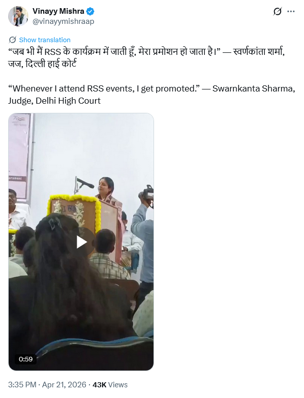 आम आदमी पार्टी के पूर्व विधायक विनय मिश्रा ने लिखा, ‘जब भी मैं RSS के कार्यक्रम में जाती हूँ, मेरा प्रमोशन हो जाता है। स्वर्णकांता शर्मा जज, दिल्ली हाई कोर्ट Whenever I attend RSS events, I get promoted. Swarnkanta Sharma, Judge, Delhi High Court’