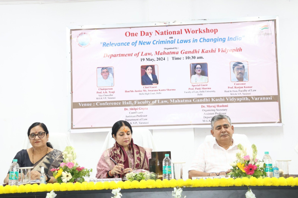 यहाँ एक बैनर पर लिखा है कि यह एक “One Day National Workshop” है, जिसका विषय है, ‘Relevance of New Criminal Laws in Changing India; (बदलते भारत में नए आपराधिक कानूनों की प्रासंगिकता)। यह कार्यक्रम 19 मई 2024 को सुबह 10:30 बजे आयोजित हुआ था।