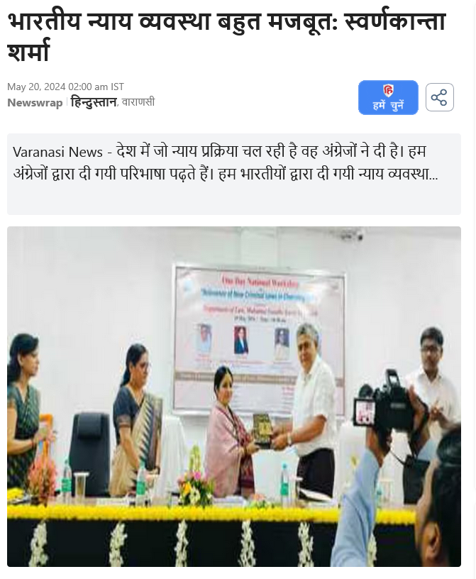 हमे इस सम्बन्ध में हिंदुस्तान की वेबसाइट पर प्रकाशित रिपोर्ट भी मिली। 20 मार्च 2024 को प्रकाशित रिपोर्ट के मुताबिक दिल्ली हाईकोर्ट की न्यायमूर्ति स्वर्णकांता शर्मा महात्मा गांधी काशी विद्यापीठ के विधि विभाग में आयोजित कार्यशाला में मुख्य वक्ता के तौर पर शामिल हुईं।