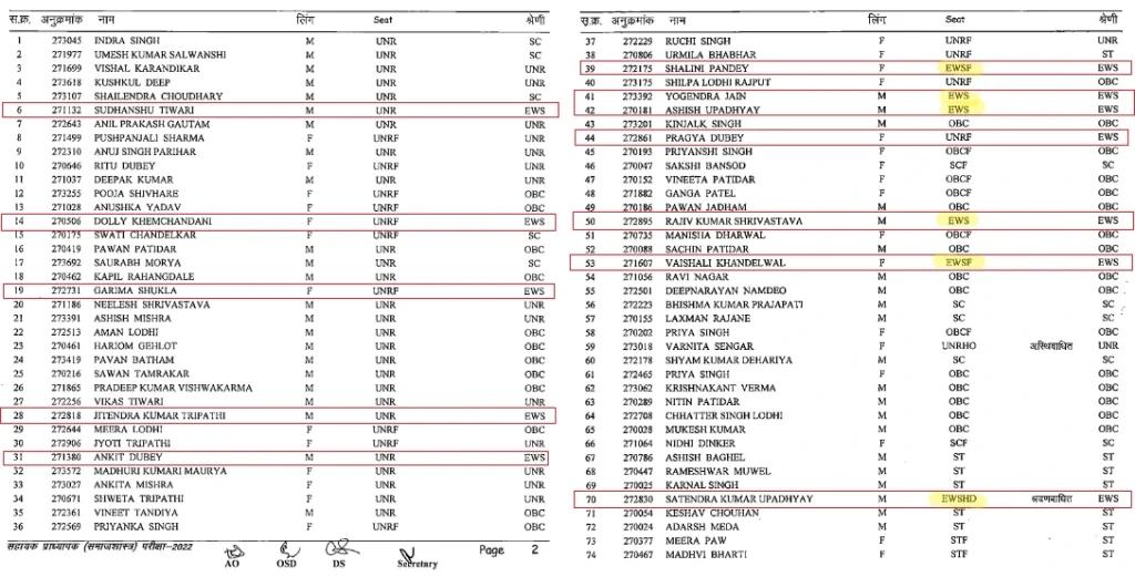 साथ ही, इस सूची में क्रम सख्या 6 पर सुधांशु तिवारी, 14 पर डॉली खेमचांदनी, 19 पर गरिमा शुक्ला, 28 पर जितेन्द्र कुमार त्रिपाठी, 31 कर अंकित दुबे, 39 पर शालिनी पांडेय, 41 पर योगेन्द्र जैन, 42 पर आशीष उपाध्याय, 44 पर प्रज्ञा दुबे, 50 पर राजीव कुमार श्रीवास्तव, 53 पर वैशाली खंडेलवाल, 70 पर सतीश कुमार उपाध्याय ने आर्थिक रूप से कमजोर वर्ग (ईडब्ल्यूएस) की श्रेणी में परीक्षा दी थी। यानि कुल 12 छात्रों में 8 ब्राह्मणों ने ईडब्ल्यूएस श्रेणी में परीक्षा दी। इसका मतलब यह भी है कि अन्य दूसरी जातियों ने इस श्रेणी में परीक्षा देने में दिलचस्पी नहीं दिखाई या वो इस श्रेणी के मानक के योग्य नहीं थे।