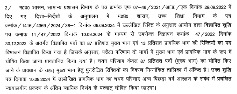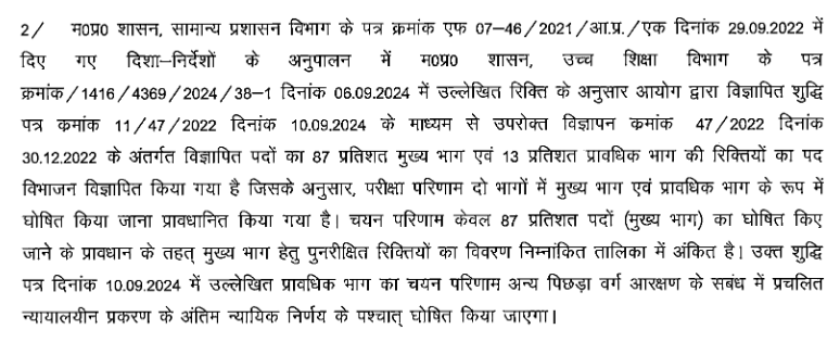 यहाँ यह भी बताया गया है कि चयन/नियुक्ति केवल 87 प्रतिशत (मुख्य भाग) पदों पर की जाएगी। बाकी 13 प्रतिशत प्रावधिक भाग के पदों पर चयन इस शर्त पर निर्भर करेगा कि अन्य पिछड़ा वर्ग (OBC) आरक्षण से जुड़ा न्यायालयीन मामला सुलझ जाए।