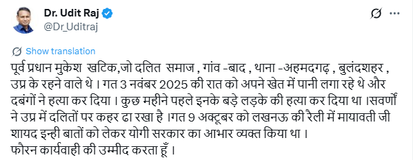 कांग्रेस नेता उदित राज ने लिखा, ‘पूर्व प्रधान मुकेश खटिक,जो दलित समाज , गांव -बाद , थाना -अहमदगढ़, बुलंदशहर, उप्र के रहने वाले थे। गत 3 नवंबर 2025 की रात को अपने खेत में पानी लगा रहे थे और दबंगों ने हत्या कर दिया। कुछ महीने पहले इनके बड़े लड़के की हत्या कर दिया था। सवर्णों ने उप्र में दलितों पर कहर ढा रखा है।’