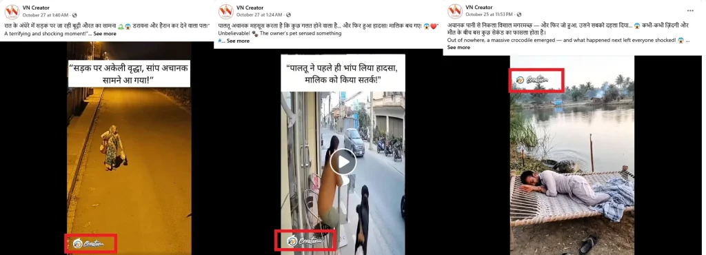 हमें पता लगा कि इसे ‘वीएन क्रिएटर‘ नाम के फेसबुक पेज ने 27 अक्टूबर को इस वीडियो पोस्ट किया था। हालाँकि इस वीडियो को अब डिलीट कर दिया गया है। ‘वीएन क्रिएटर’ के फेसबुक पेज पर सडक पर सांप, मगरमच्छ, टाईगर जैसे कई वीडियो मौजूद हैं। इन वीडियो में इस फेसबुक पेज अपने Logo और सफेद पट्टी से, सोरा का Logo छुपा दिया है। सोरा एक ओपेन एआई का वीडियो बनाने का टूल है। इसी की मदद से AI वीडियो बनाए हैं।