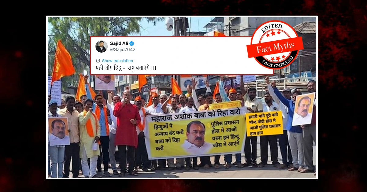 महाराष्ट्र के नासिक से सामने आया एक मामला इन दिनों पूरे देश में चर्चा का विषय बना हुआ है। खुद को महादेव का अवतार बताने वाला अशोक खरात उर्फ ‘भोंदू बाबा’ अब गंभीर आरोपों के घेरे में है। उस पर महिलाओं को झांसे में लेकर यौन शोषण करने का आरोप लगा है। नासिक क्राइम ब्रांच ने अशोक खरात को 17 मार्च को एक महिला की शिकायत के आधार पर गिरफ्तार किया था। इसी बीच सोशल मीडिया में एक तस्वीर वायरल है, तस्वीर के साथ दावा है कि हिंदू समाज के लोग अशोक खरात के समर्थन में सड़कों पर प्रदर्शन कर रहे हैं, साथ ही उसे रिहा करने की मांग की है।