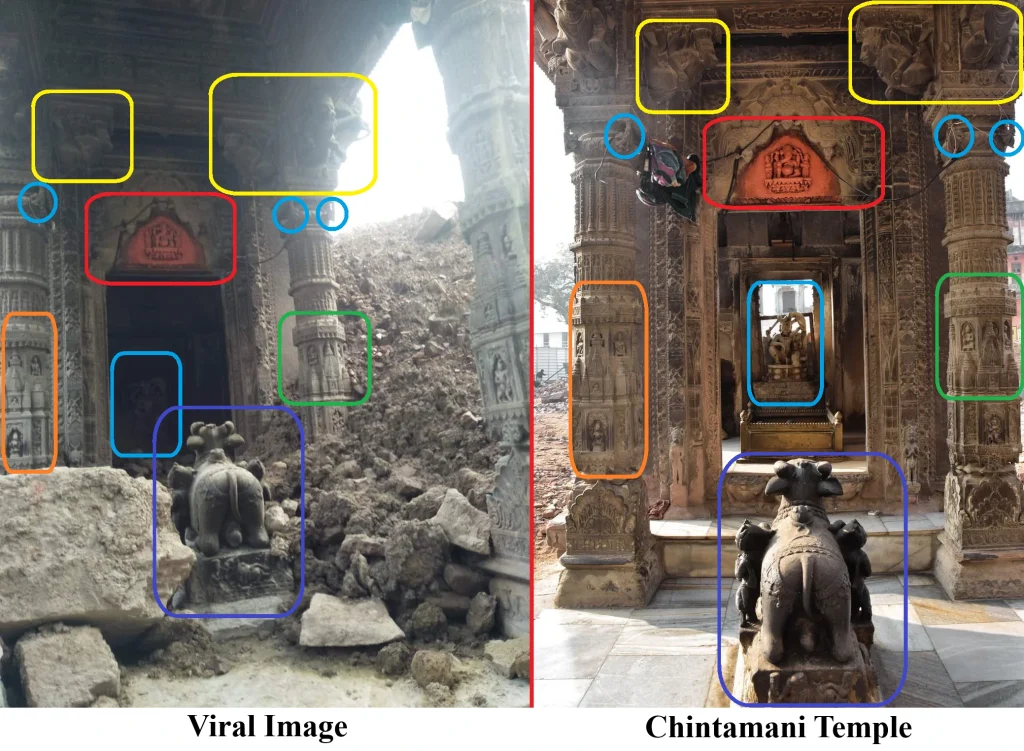 हमने वायरल मंदिर की तस्वीर और ‘Cultural heritage of varanasi’ की वेबसाइट पर मौजूद ‘श्री चिंतामणि महादेव मंदिर ‘ में कई समानताएं देखी। दोनों तस्वीरों की वास्तुकला, नक्काशी, नंदी, स्तम्भ, मूर्तियाँ एक-दूसरे से मेल खाती हैं।