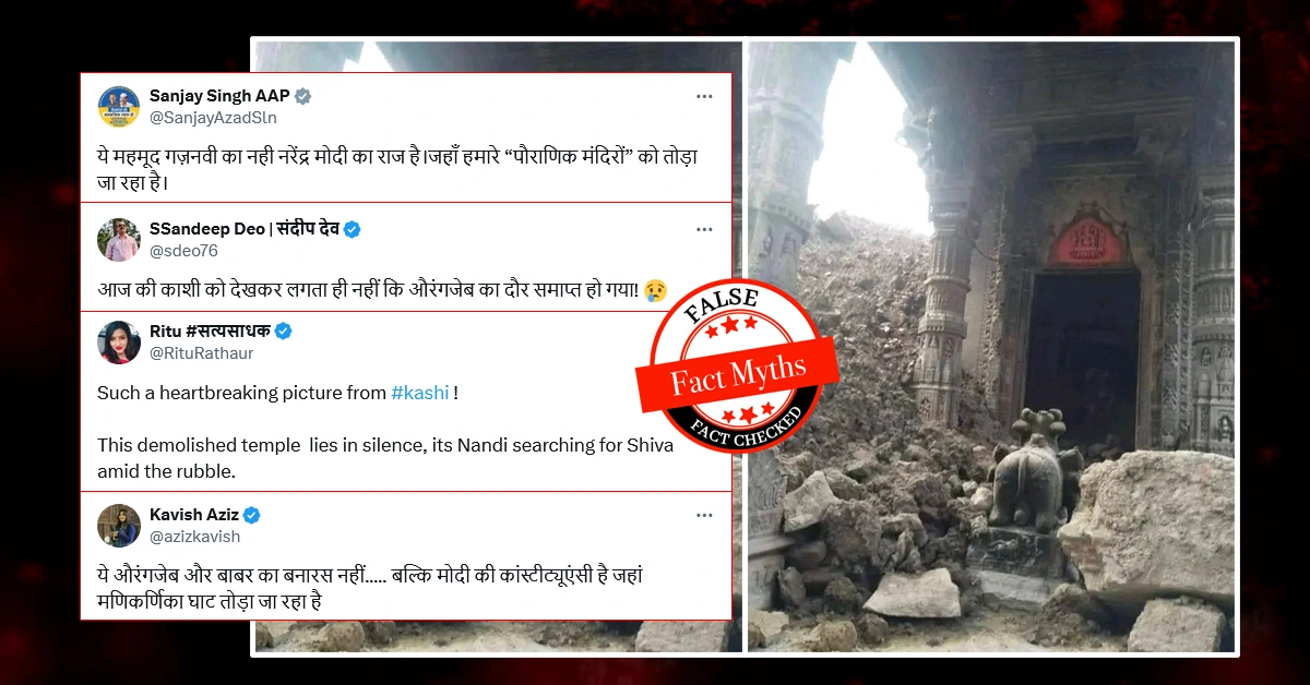 वाराणसी के मणिकर्णिका घाट पर पुनर्विकास और सौंदर्यीकरण कार्य चल रहा है। इस बीच सोशल मीडिया में भगवान शिव के एक मंदिर की तस्वीर वायरल है। लोग दावा कर रहे हैं कि मणिकर्णिका घाट पर इस मंदिर को तोड़ दिया गया। हालाँकि पड़ताल में पता चलता है कि यह तस्वीर करीबन 5 साल पुरानी है, साथ ही यह मंदिर भी सही सलामत है।