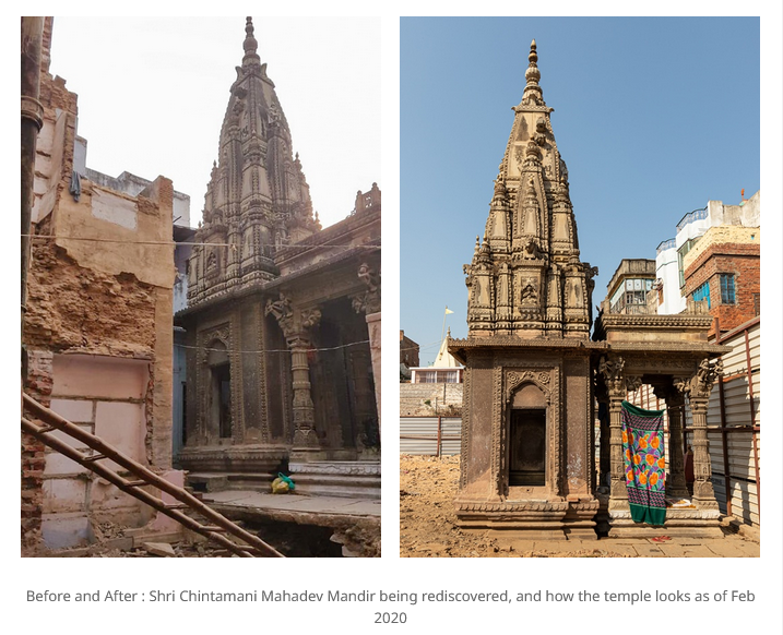 आगे की पड़ताल में हमे इस मंदिर की कई तस्वीर ‘Cultural heritage of varanasi‘ की वेबसाइट पर मिली। इस मंदिर का नाम ‘श्री चिंतामणि महादेव मंदिर’ है, इसे काशी विश्वनाथ कॉरिडोर का मंदिर बताया गया है। रिपोर्ट में लिखा है कि श्री चिंतामणि महादेव मंदिर भगवान शिव को समर्पित है। वाराणसी में स्थित शिवालयों के नामों के अंत में अक्सर ‘ -ईश्वर ‘ प्रत्यय लगा होता है। लेकिन यह मंदिर इस परंपरा से अलग है, जिसका नाम शिव के बड़े पुत्र गणेश के नाम पर रखा गया है, जिन्हें चिंतामणि के नाम से भी जाना जाता है।