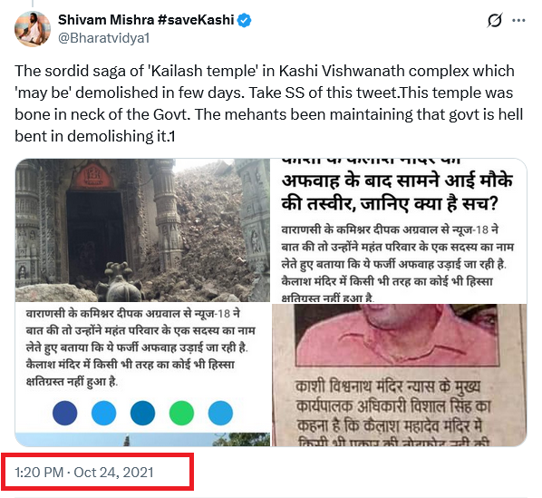 क्या है हकीकत? पड़ताल में हमे यह तस्वीर एक्स यूजर शिवम मिश्रा के एक पोस्ट में मिली। शिवम मिश्रा ने वाराणसी में काशी विश्वनाथ कॉरिडोर निर्माण कार्य के दौरान मंदिर तोड़ने की घटनाओं के खिलाफ आवाज उठाई थी। उन्होंने 24 अक्टूबर 2021 को इस तस्वीर को पोस्ट करते हुए लिखा था, ‘काशी विश्वनाथ कॉम्प्लेक्स में ‘कैलाश मंदिर’ की गंदी कहानी, जिसे कुछ ही दिनों में गिराया जा सकता है। इस ट्वीट का स्क्रीनशॉट ले लें। यह मंदिर सरकार के लिए गले की हड्डी बन गया था। महंतों का कहना था कि सरकार इसे गिराने पर तुली हुई है।’