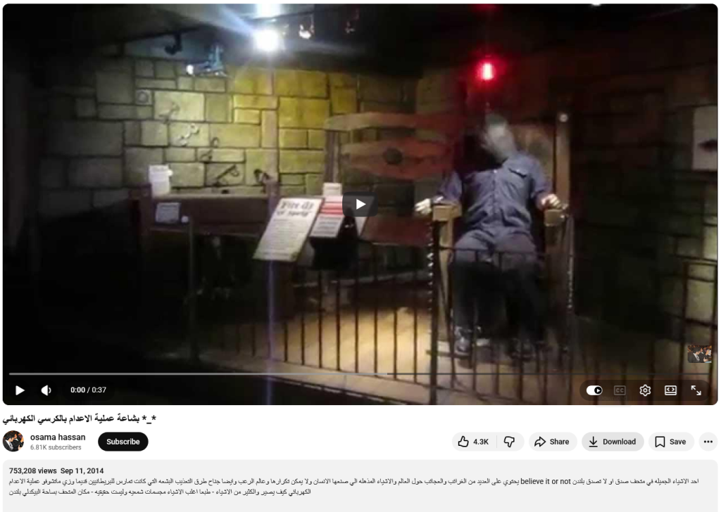 वीडियो के साथ कैप्शन में बताया गया है कि लंदन में बिलीव इट ऑर नॉट! म्यूज़ियम की एक अच्छी बात यह है कि इसमें दुनिया भर की कई अजीब और अद्भुत चीज़ें हैं, इंसानों की बनाई ऐसी अद्भुत चीज़ें जिन्हें कॉपी नहीं किया जा सकता, डरावनी दुनिया, और पुराने समय में ब्रिटिश लोगों पर किए जाने वाले टॉर्चर के भयानक तरीकों पर एक विंग भी है। जैसा कि आप देख सकते हैं, बिजली का झटका देने का प्रोसेस किया जाता है और भी बहुत कुछ। बेशक, ज़्यादातर चीज़ें मोम के मॉडल हैं और असली नहीं हैं। यह म्यूज़ियम लंदन के पिकाडिली सर्कस में है।