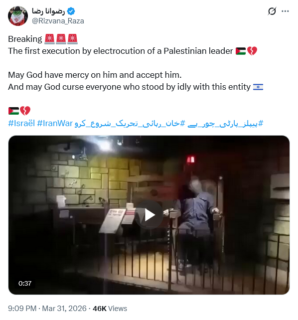 एक यूजर @55MTQ_ ने लिखा, ‘कल बिल पास हुआ और आज से इजरायल Palestine कैदी को बिजली के झटके से मौत की सजा देने लगा यहूदियों की जानिब से फिलिस्तीनी कैदी को करंट दे कर दर्दनाक मौत की विडियो सामने आई’