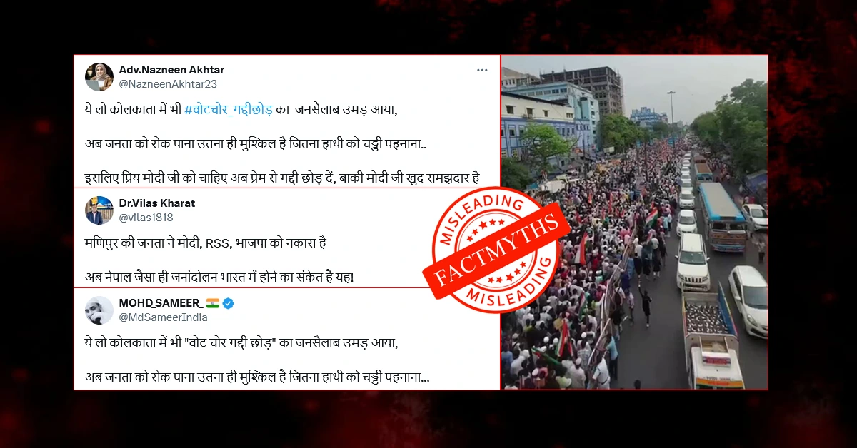 | मणिपुर और कोलकाता में पीएम मोदी के खिलाफ प्रदर्शन हुआ, वोट चोर गद्दी छोड़ के नारें लगाए गये। | यह वीडियो पश्चिम बंगाल के कोलकाता में वक्फ (संशोधन) अधिनियम के खिलाफ आईएसएफ के विरोध प्रदर्शन का है। अप्रैल माह के इस वीडियो में ‘वोट चोर गद्दी छोड़’ जैसे नारों को अलग से जोड़ा गया है। |