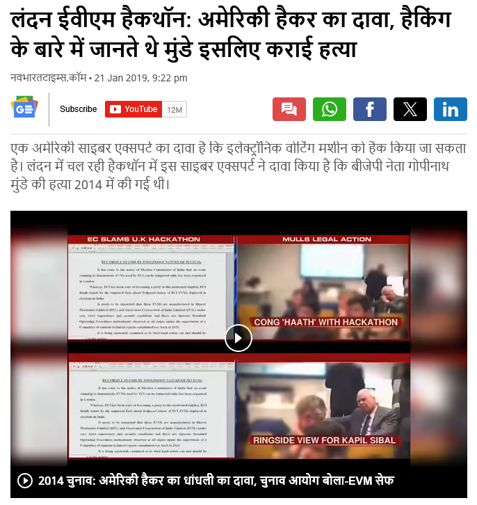 इस सम्बन्ध में 21 जनवरी 2019 को टाइम्स ऑफ इंडिया, एनबीटी की वेबसाईट पर प्रकाशित रिपोर्ट मिली। इस रिपोर्ट से इस बात की पुष्टि होती है कि सैयद सुजा ने साल 2019 में भी ईवीएम हैक का दावा किया था। सैयद सुजा ने लंदन में बताया कि भाजपा नेता और केंद्रीय मंत्री गोपीनाथ मुंडे की सड़क हादसे में मौत नहीं हुई थी, बल्कि उनकी हत्या की गई क्योंकि उन्हें 2014 के आम चुनावों में ईवीएम हैकिंग के बारे में पता था। शुजा ने दावा किया कि उन्होंने 2009-2014 तक ECIL के लिए काम किया। शुजा ने कहा कि वह उस टीम का हिस्सा थे जिसने 2014 के चुनावों में इस्तेमाल की गई ईवीएम को डिजाइन किया था। 2014 में भारत से भाग गया था क्योंकि अपनी टीम के कुछ सदस्यों की हत्या के बाद उसे देश में ख़तरा महसूस हुआ था।