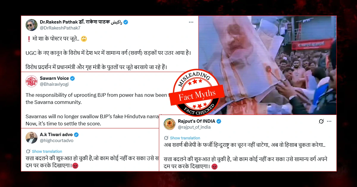 देश भर यूजीसी नियमावली के खिलाफ नाराजगी के बीच सोशल मीडिया में एक वीडियो वायरल है। इस वीडियो में एक भीड़ प्रधानमंत्री नरेंद्र मोदी और गृहमंत्री अमित शाह के पुतलों पर जूते मार रही है। इसके बाद दोनों पुतलों को जला दिया जाता है। लोग दावा कर रहे हैं कि यह वीडियो यूजीसी के खिलाफ प्रदर्शन प्रदर्शन का है।