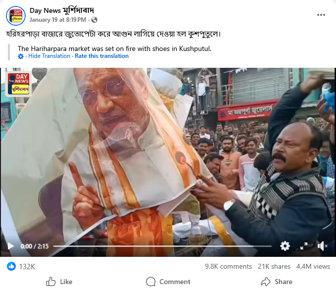 क्या है हकीकत? पड़ताल में हमने इस वीडियो के अलग अलग स्क्रीनशॉट को गुगुल रिवर्स सर्च किया तो यह वीडियो हमे पश्चिम बंगाल के एक मडिया संस्थान ‘Day News Murshidabad’ के फेसबुक पेज पर मिला। इस वीडियो को 19 जनवरी को पोस्ट किया गया था, पोस्ट के साथ बताया गया है कि हरिहरपारा बाजार में पुतले को जूते मारकर आग लगा दी गई।