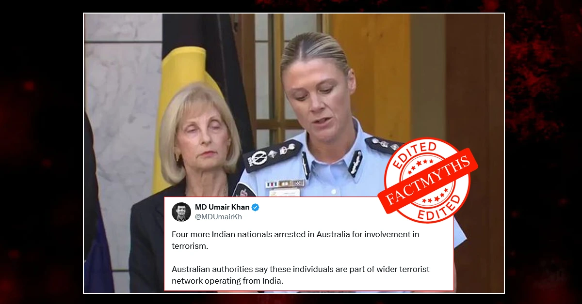 एमडी उमैर खान ने लिखा, ‘ऑस्ट्रेलिया में आतंकवाद में शामिल होने के आरोप में चार और भारतीय नागरिकों को गिरफ्तार किया गया है। ऑस्ट्रेलियाई अधिकारियों का कहना है कि ये लोग भारत से ऑपरेट होने वाले एक बड़े आतंकवादी नेटवर्क का हिस्सा हैं।’