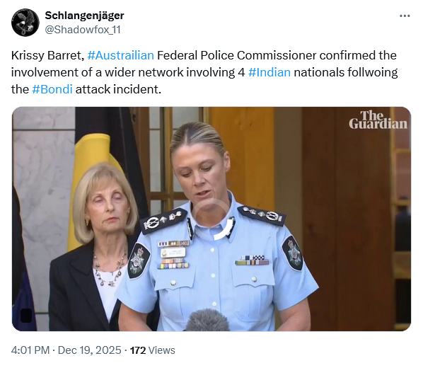 Schlangenjager ने लिखा, ‘क्रिस्टी बैरेट, ऑस्ट्रेलियाई फेडरल पुलिस कमिश्नर ने बॉन्डी हमले की घटना के बाद 4 भारतीय नागरिकों वाले एक बड़े नेटवर्क के शामिल होने की पुष्टि की है।’